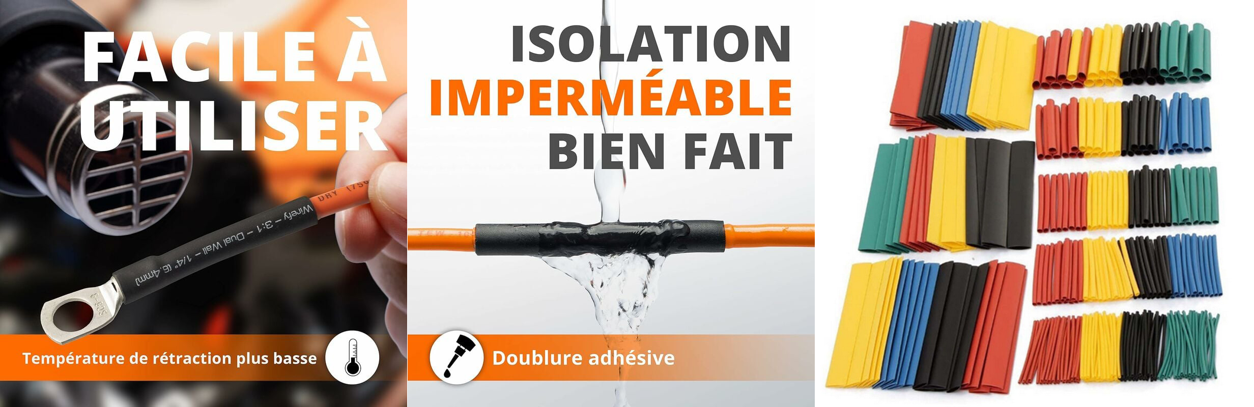 Gaine thermorétractable noire en polyoléfine souple, destinée à l’isolation électrique, la protection mécanique des câbles et fils, ainsi qu’au regroupement et à l’identification des conducteurs. À la chaleur, la gaine se rétracte pour épouser la forme du support.